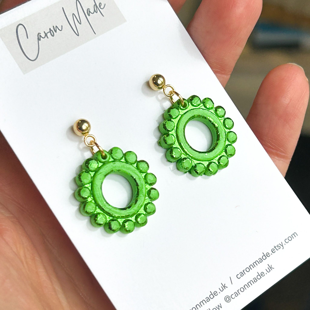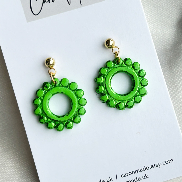 Bright green round embossed earrings
