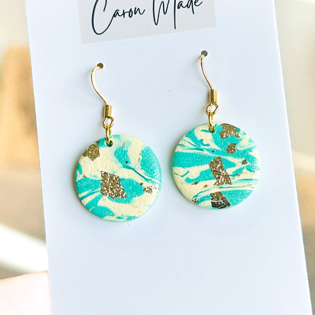 Medium green and gold terazzo style earrings with gold hooks